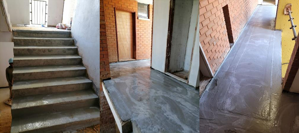Walkways, Landings, Dry yards & Steps Thermoflex primer with a 4mm Torch on system to be applied. Elastorcrete to be applied after waterproofing for tiling.